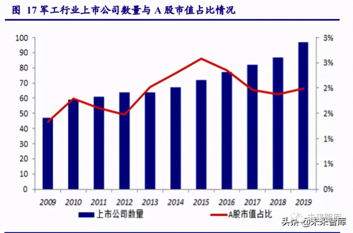 2019 年底,军工上市公司共 99 家,数量占比 A 股整体的 2.45%,市值占比为 2.46%。从 A 股上市公司数量来看,2009 年至今军工行业平均每年有约 5 家公司新上市,其中 2010 年上 市数量创历年之最,达到 12 家。从 A 股市值占比来看,2009 年-2015 年军工板块市值占 A 股 总市值比例分别为 1.34%、1.79%、1.60%、1.47%、2.02%、2.29%、2.59%,A 股市值占比整 体来看逐年提升。截至到 2020 年 9 月 25 日,市值排名前五位的上市分别是中国重工、航发动 力、中国船舶、中航沈飞、中航飞机。