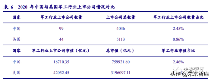 在上市公司数量方面,截至 2020 年 9 月 25 日,中国 A 股共有上市公司 4036 家,其中 军工行业上市公司 99 家,占比 2.45%;美股上市公司总数为 5113,高于 A 股,但军工行业上 市公司数仅 44 家,同 A 股相比占比相差较大,仅 0.86%。在市值规模方面,中国 A 股总市值为 759921.80 亿元,其中军工行业 18710.35 亿元,占比为 2.46%;美股上市公司总市值为 3196097.11 亿元,其中军工行业 42052.45 亿元,占比 1.32%。我们认为,美国军工行业在上 个世纪 90 年代经历了并购浪潮后,上市公司数量急剧减少,虽然美国军工行业公司数量占比 明显少于中国,但其市值规模却是中国的 2 倍多,相比之下中国军工行业上市公司的市值规模 仍有较大上升空间。