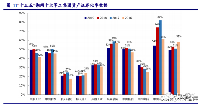 近年来,军工集团资产证券化运作持续不断,包括独立 IPO、分板块注入上市公司等,资 产证券化率不断提升。根据 2019 年最新数据,分集团来看,资产证券化率在 50%以上的有 4家,分别是中航工业集团、兵器装备集团、中国船舶集团和中国电子信息集团,其中中国电子 集团最高,约为 54%,中航工业集团起步较早,资本运作积极,船舶系集团后来居上,近年 来也取得较大进展。资产证券化率在 30%及以下的军工集团有 2 家,分别是中国航天科工集 团和中国航天科技集团,2 家集团资产优质,证券化空间较大,未来注入预期有望走高。从注 入资产性质的演变进程来看,整体呈现出从早期的外围元器件资产到系统级资产再进一步到核 心军品、总装类资产的循序渐进注入过程。