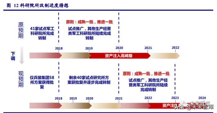 2022-2024 将迎院所改制注入高峰,进入资产证券化 2.0 时代。2018 年初,国防科工局发 布《涉军企事业单位改制重组上市及上市后资本运作军工事项审查申报指南(2018 年版)》, 我们认为作为后续配套政策,随着院所改制试点工作逐步完成,研究所优质资产注入上市公司 政策障碍将逐步消除,事业单位资产注入预期有望大幅提升。