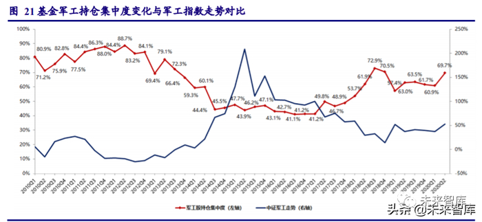 2、基金军工持仓集中度大幅提升,马太效应再次显现。从指数走势相关性来看,2010Q1 至 2020Q2 基金军工持仓集中度指标与军工指数走势指标的相关系数为-0.83,呈负相关关系。2014Q2 至 2017Q1 基金持仓集中度主要集中在 41%至 47%间窄幅波动。为了增强弱市环境中的抗风险能力,2017Q2 之后,随着军工指数持续下探,基金持仓集中度逐步提升至 2018Q3 的 73%,主动型公募基金对白马股抱团现象凸显。2018Q4 基金持仓集中度指标首次出现回落, 2019Q1 至 2020Q1 期间在 60%附近一直反复。2020Q2 该指标环比大幅提升 8.8pct,表明在其 它板块强势上涨的背景下,机构投资者对军工板块的风险偏好再度走弱,拥抱确定性的心态再 次凸显。展望未来,我们认为,随着中美博弈持续升级,军工板块投资偏好将明显提升,持仓 集中度指标将回落,配置上仍建议以龙头白马为基,择机布局真成长中小盘个股。