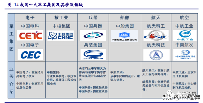 在十大军工集团的引领下,我国的军工行业在发展进程中逐渐形成了“小核心、大协作” 的产业格局:将重大项目的系统设计、关键技术和系统集成等研制生产能力,作为十大军工集 团主承包商发展的主体,形成“小核心”;分系统配套和零部件原材料供应立足全社会布局,分 层次展开竞争,最终形成基于国民经济基础的“大协作”。这种产业格局突出了主营业务,强化 了军品基业,提高了资源的利用率,形成了整体上的优化。