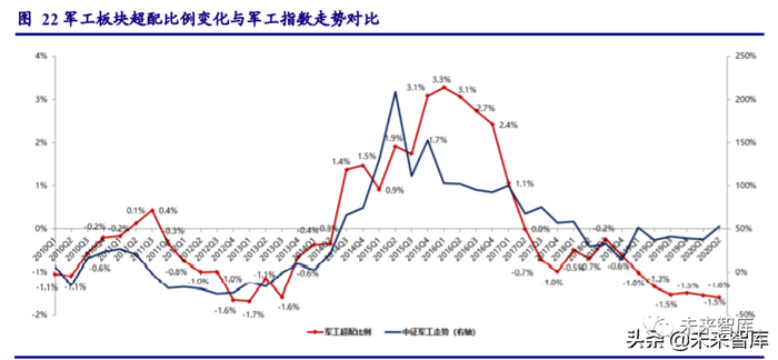 3、军工板块低配格局现企稳迹象,未来有望逐步走高。从指数走势相关性来看, 2010Q1 至 2020Q2 的基金军工超配比例指标与军工指数走势指标的相关系数为 0.74,呈 正相关关系。军工板块持续低配,但自 2019Q3 开始,板块超配比例指标一直维持在-1.5% 附近,我们认为,指标出现企稳迹象,随着市场风险偏好的回升,基金配置积极性有望逐 步走高。
