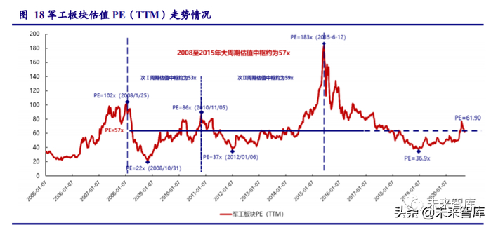 次Ⅰ周期阶段,板块上市公司军品业务占比较小,主管部门对军工资产注入的态度并不明 确,此阶段行业估值水平主要反映公司的内生增长和外延并购情况,集团资产注入因素几乎没 有纳入考量;次Ⅱ周期阶段,随着航发动力为代表的军工上市公司核心军品资产注入的启动, 主管部门支持军品证券化的态度逐渐明朗,资产注入开始作为重要因素纳入行业估值水平的考 量并一直被演绎放大,直到 2015 年年中达到峰值。自 2015 年 6 月以来,市场渐渐回归理性, 资产注入预期对板块估值水平的边际影响减弱。展望未来,我们认为行业估值中枢应该较好的 平衡次Ⅰ周期和次Ⅱ周期两个阶段,因此我们选取 2008 年 1 月至 2015 年 6 月大周期的估值中 枢来作为参照标准。