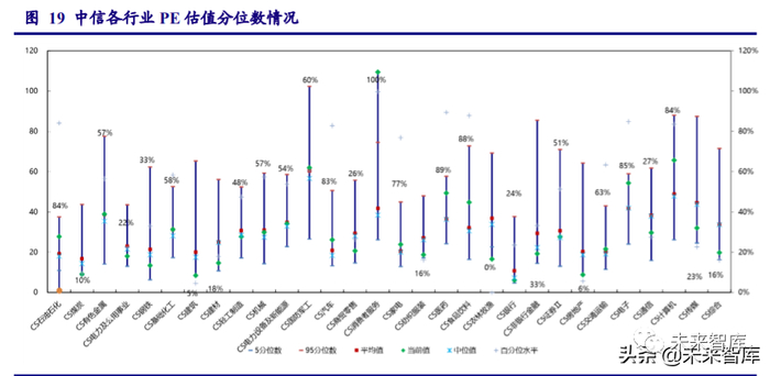 从横向对比来看,参照中信一级行业分类,截至 2020 年 9 月 25 日,估值前三位的行业分 别为消费者服务(109.5 倍)、计算机(65.7 倍)、国防军工(61.9 倍),估值后三位的行业 分别为银行(6.1 倍),建筑(8.5 倍)、房地产(8.9 倍)。对比各行业历史均值水平,消费 者服务、医药生物、食品饮料等行业估值明显高于历史均值,而农林牧渔、房地产、煤炭、银 行、建筑等行业则明显低于历史均值。相较于其它科技类板块,军工行业的估值水平虽然相对 较高,但估值分位数仅为 60.4%,仍有较大的上升空间,且部分龙头白马及真成长优质个股的 估值水平依然与业绩增速相匹配,具备较高的投资价值。