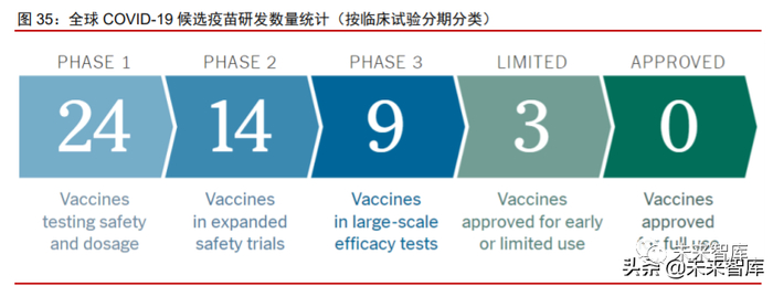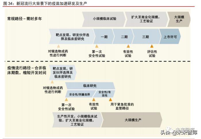 新冠疫苗研制有望加速。①利用创新的技术手段有望加速疫苗的研制。例如陈薇院士 团队在 2014 年仅用短短 4个月时间,就利用腺病毒技术载体将埃博拉疫苗推入临床研究, 并经过严谨的 I-III 期试验,于 2017 年 10 月成为全球首个埃博拉疫苗获批新药,整体仅耗 时 3 年;②考虑到疫情的严重及急迫性,国家相关部门有望提速疫苗研发中的审评审批、 新药注册和生产环节。结合创新的技术及国家政策的加速料将使得新型疫苗原本 12-15 年的研发周期大大缩短。