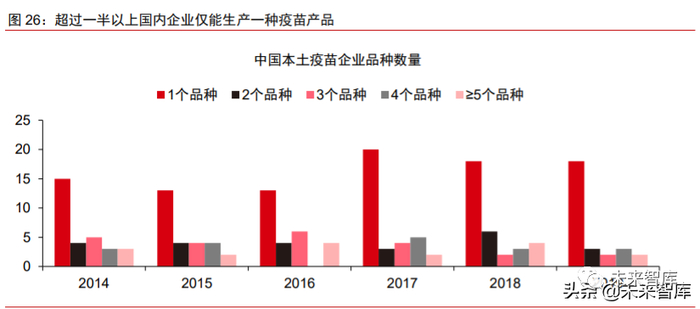 中国疫苗生产企业规模小,品种单一。中国绝大多数疫苗生产商规模偏小,生产的疫 苗多数也是传统的疫苗,产品同质化问题严重,一个品种通常有多家企业竞争。除了中国 生物技术旗下 6 大生物制品研究所外,超过一半的国内企业每年获得批签发的疫苗品种仅 有 1 个。