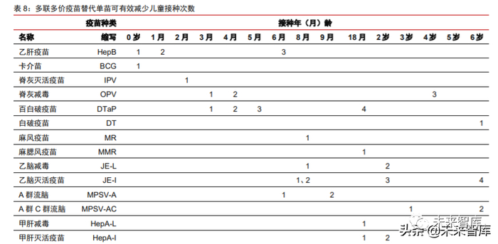 多联多价苗占比提高是中国疫苗行业未来发展趋势。我国免疫规划中儿童常规免疫 15 种疫苗在 3 周岁之前共需进行约 23 针次,预防接种的高次数也易给家长和医务人员带来 不便,容易因接种时间冲突造成全程接种率降低和预防接种工作成本的增高等问题。而多 联多价疫苗能够有效减少接种次数,从而解决以上问题,因此研发和推广多联多价疫苗是 疫苗行业未来发展的主要趋势。