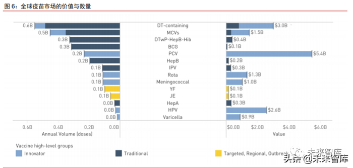 针对新亚型或不同菌株病毒的疫苗:例如采用新的抗原,主要针对现在无疫苗覆 盖的疾病。新型疫苗的尽管销量低于传统疫苗,但占据着全球疫苗市场主要份额, 目前市场价值最高的肺炎疫苗(PCV)领域,完全由新型疫苗覆盖,其余排名前 列疫苗市场价值也均完全或大部分由新型疫苗贡献。