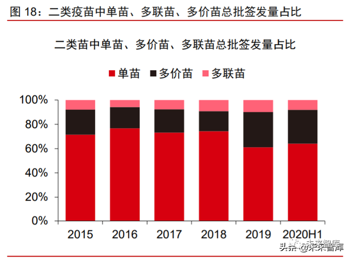 多联苗、多价苗总批签发量占比呈逐渐提高。从批签发量的角度看,近五年中国一类、 二类疫苗中,多联苗、多价苗总批签发量占比呈逐渐提高,由 2015 年 36.92%提升至 2020H1 的 42.78%。在二类疫苗中,多联苗、多价苗总批签发量占比也是明显提高,由 2015 年 28.57%提升至 2020H1 的 35.91%。随着宫颈癌、肺炎、流感等多价疫苗以及三 联苗、四联苗、五联苗等多联疫苗的进一步放量,多联多价疫苗总批签发量占比预计将继 续提高。