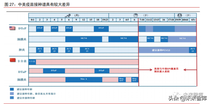 6 岁以上的青少年及成年人疫苗市场空白。对比中美疫苗接种谱(针对脑膜炎、 肺炎及百白破),美国针对青少年及成年人已有多款疫苗在使用,例如针对脑膜 炎的 MCV4 以及针对肺炎的 PCV13。而国内针对此年龄段的市场一片空白,有 望迎来重大发展机遇。