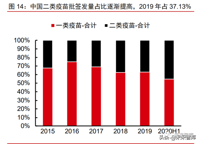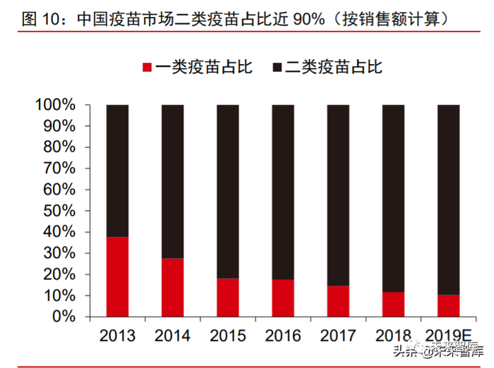 一类疫苗市场占比逐渐下降。根据《疫苗流通和预防接种管理条例》,国内疫苗主要 分为一类疫苗和二类疫苗,接种一类疫苗的费用由政府承担,二类疫苗由受种者或者其监 护人承担费用。根据灼识咨询统计,一类疫苗的市场占比不断下降,从 2013 年的 37.7% 下降至 2019 年的 10.29%。考虑到目前国内一类疫苗接种率普遍超过 90%,若未来中国 新生儿数保持稳定不出现新的“婴儿潮”,且假设一类疫苗品种不再扩容,未来中国一类 疫苗市场规模预计保持稳定。