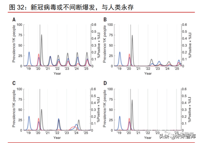 截至 2020 年 9 月 20 日,新型冠状肺炎(COVID-19)已造成接近 2600 万人的感染, 其中包括近 97 万人的死亡,WHO 预测 COVID-19 可能要在 2021 年才能得到完全控制。至于大流行后的未来,根据今年 4月哈佛大学的团队在Science发表了一篇文章显示,Marc Lipsitch 利用新冠病毒类似的冠状病毒 OC43 和 HKU1 在美国的传播数据对新冠未来长时 间流行情况作出预测:
