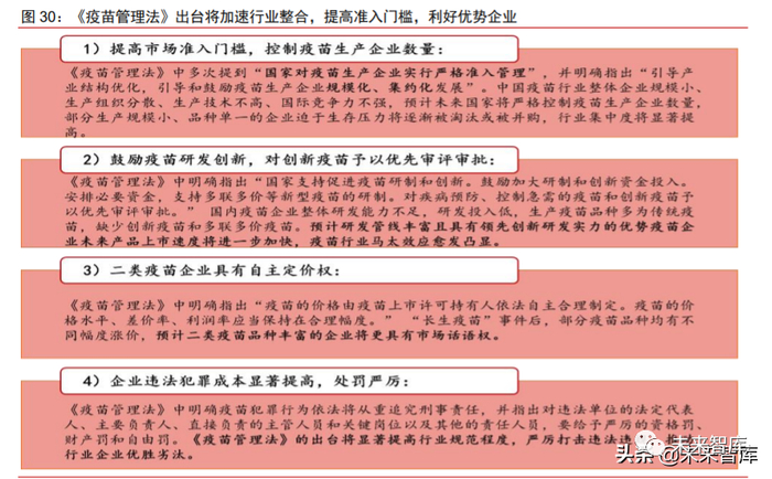 “长生疫苗”事件爆发,监管体系升级。2018 年,长生生物在飞行检查中被发现生 产过程中使用过期原液,更改生产日期,严重违反药品 GMP 准则。事件发生后,国家积 极推动疫苗行业整合重组工作,大力加强疫苗行业严格监管。2019 年 10 月 15 日,工业 和信息化部副部长王江平在中国疫苗行业协会成立大会上表示,相关部门正在研究推动疫 苗行业整合重组工作,以通过提高行业准入门槛,加强产业质量监管,鼓励集团化发展,完善招标采购等政策措施,逐步提高疫苗行业集中度。除对生产流程监管加强外,《疫苗 监管法》鼓励研发创新,全方位维护消费者权益,推动疫苗行业自主健康成长。