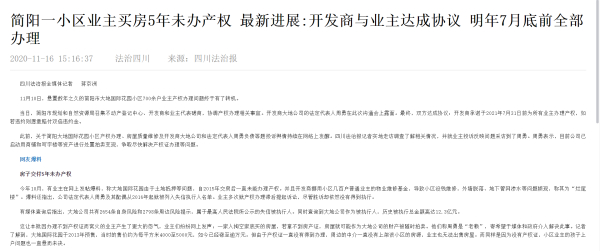 11月10日,四川法治报记者来到简阳大地国际花园小区实地调查发现,小区外墙有个别地方砖块脱落,地下停车场有污水渗漏的痕迹。除此以外,外观上与其他小区无异,目前小区内几百户业主生活秩序正常,并非网传“烂尾楼”。当日,简阳市规划和自然资源局召集不动产登记中心、开发商和业主代表磋商,协调产权办理相关事宜。双方达成协议:开发商承诺于2021年7月31日前为所有业主办理产权,如若违约则愿意赔付双倍违约金。但对于此份协议能否落实,业主对四川法治报也表达了忧虑:“周勇2017年就承诺过给我们办理产权,后来也没有履行承诺。这次到底能不能成?”