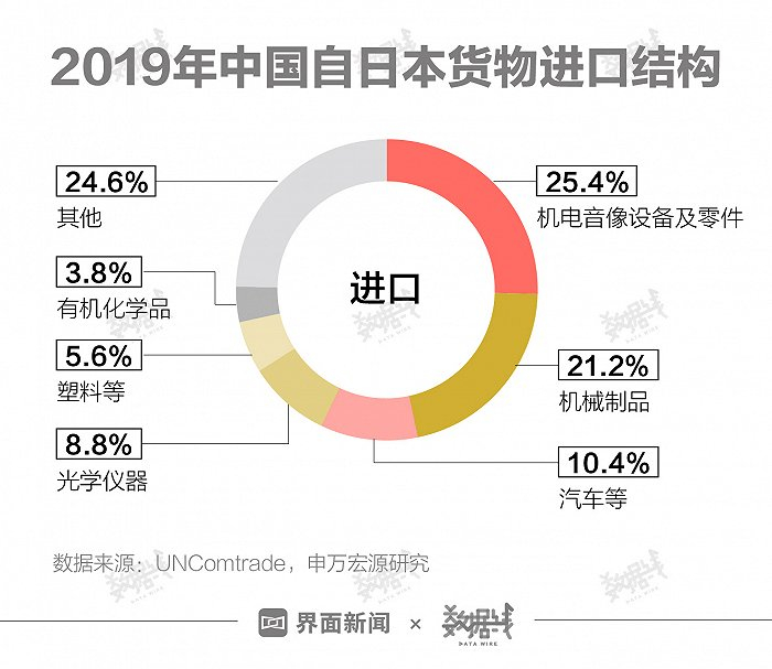 2019年,中国自日本进口的主要商品为机电音像设备及零件、机械制品,以及汽车等产品,这三类产品占中国对日本出口货物总量的57%。