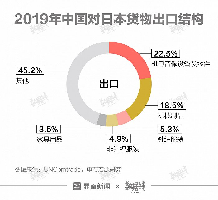 数据显示,2019年,中国对日本出口的主要商品为机电音像设备及零件、机械制品和纺织服装产品,上述商品占中国对日本出口货物总量的51.2%。