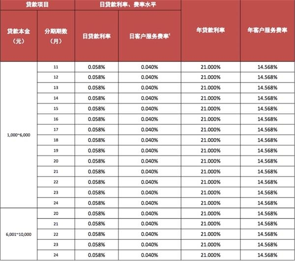 其中,客户服务费为按月支付,服务内容包含账户维护、24小时客服、还款渠道维护等。年贷款利率21%加上年客户服务费率近15%,实际需要支付的贷款成本或已近36%。
