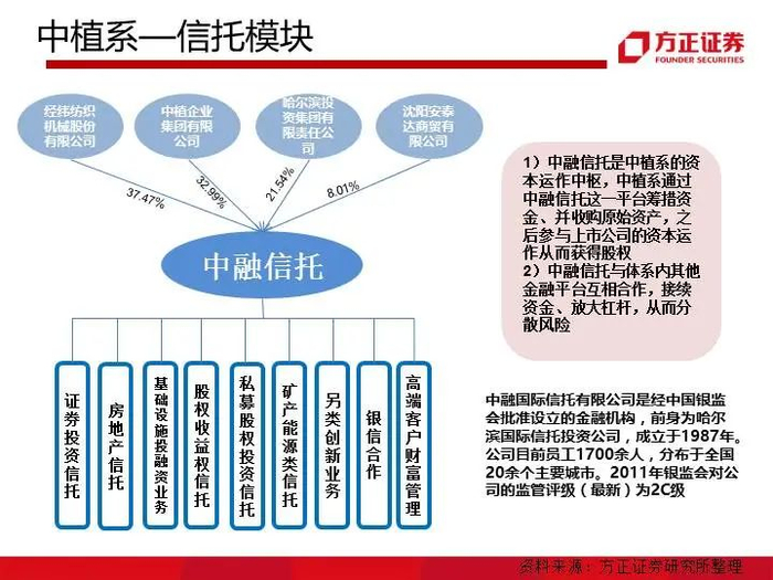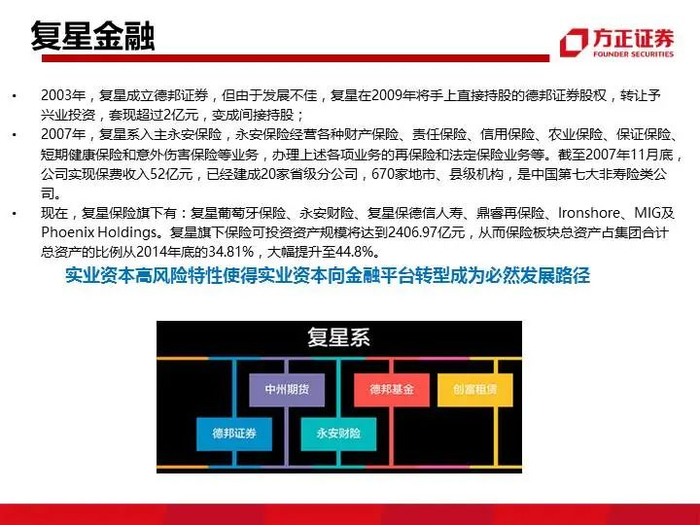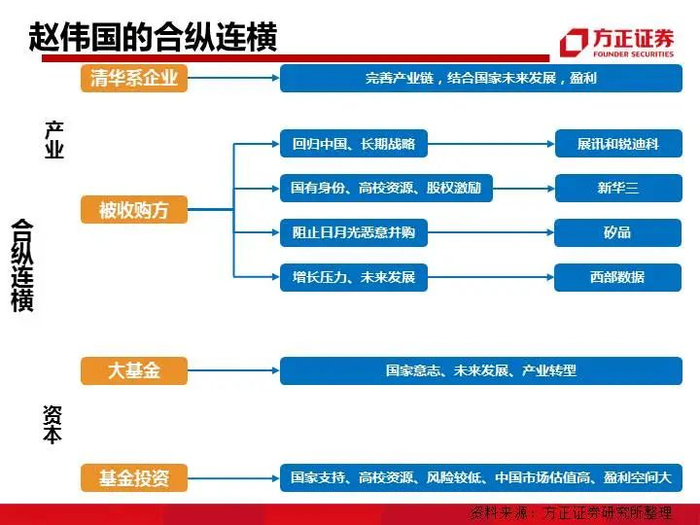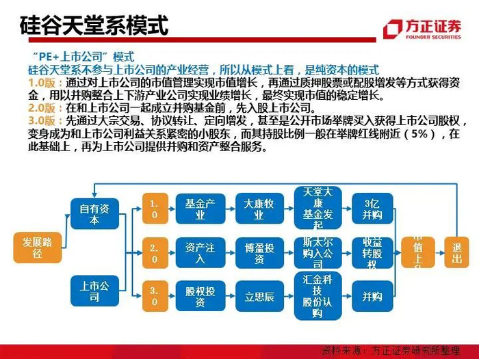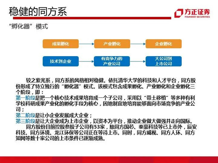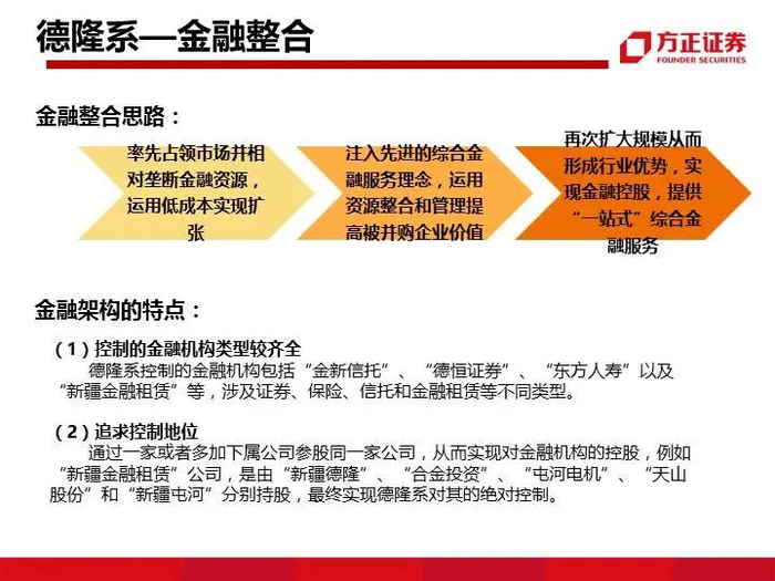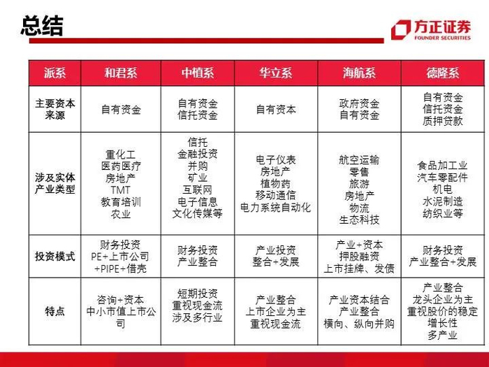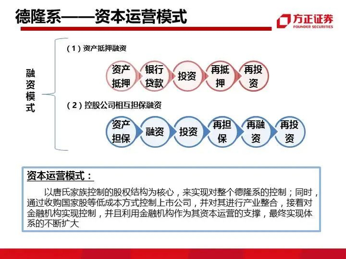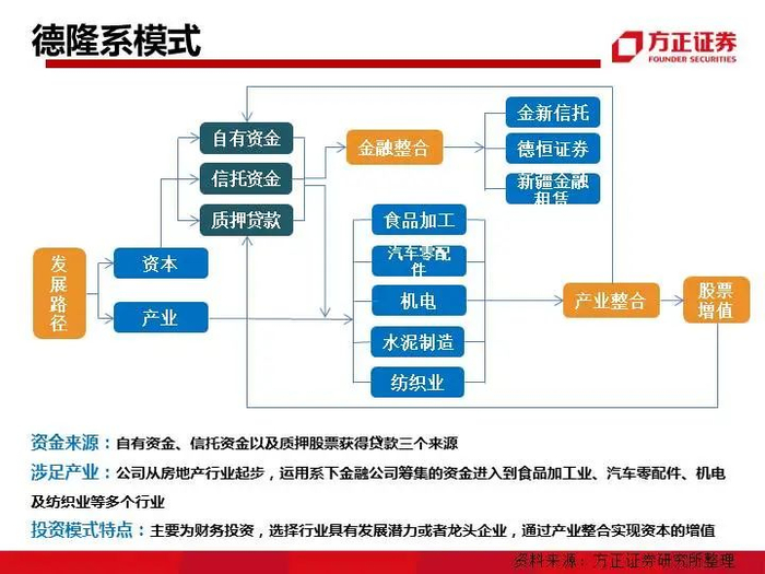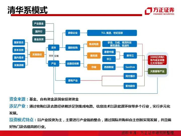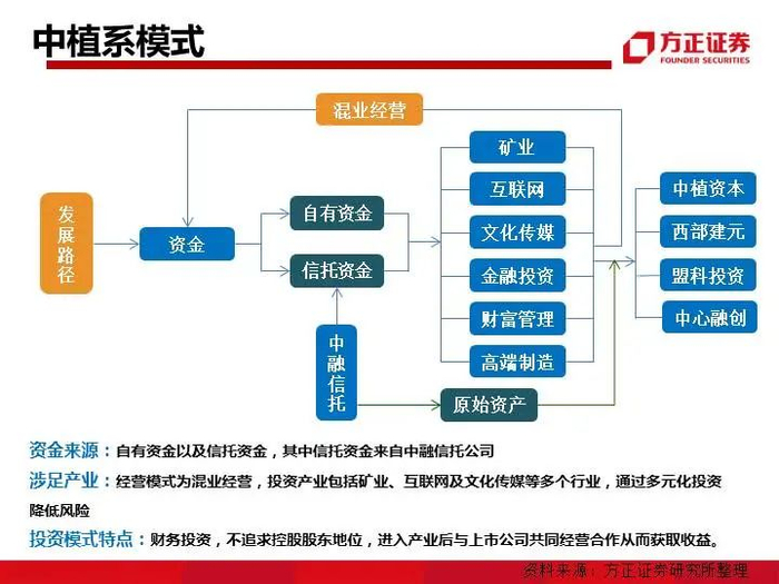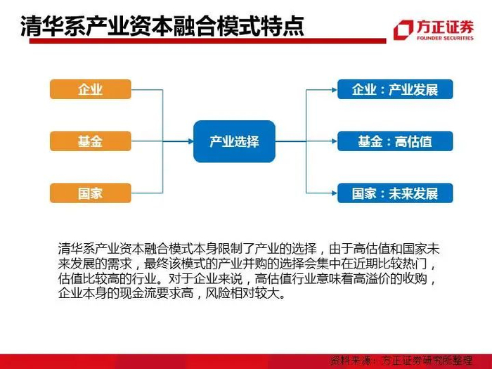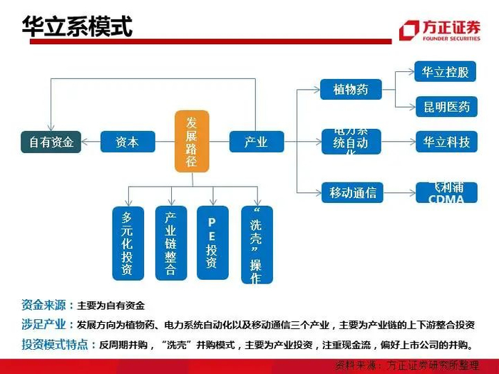 4、产融结合模式:一般具有一定规模的大型集团可以用这种模式进行派系扩张。这种模式是产业和资本相结合,不仅仅是在产业上进行产业整合调整,改进主要经营业务,还有相匹配的资本运作来提供资金支持,注重投资方面的收益,实现金融运作与实业扩张的双管齐下。现在的大型集团很多都在实业和资本一起发展,旗下一般都有产业子公司和负责资产管理的财务子公司。典型代表:紫光系、海航系。