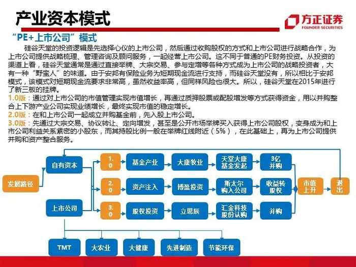 2、财务投资:通常是资产管理公司、保险公司、咨询公司等采用的投资模式,这种模式注重的是资本溢价,倾向于短期操作,一般仅仅是提供资金投资,基本不涉足于企业经营业务,或者仅仅涉足企业的管理,但不对企业的主营经营活动插手。典型代表:安邦系、硅谷天堂、和君系、中植系、德隆系等