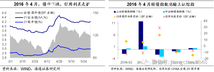 16年4月多起超预期违约事件叠加地方债天量供给,债市下跌,信用利差走扩,转债超调。2016年上半年国企债违约现象严重,23只违约债券中有15只是国企债。4月多个超预期信用事件集中爆发:东特钢-第一起地方国企违约、中煤华昱-第一个央企煤炭债违约、铁物资-AA+央企公告债务重组并暂停交易、城投债提前偿还,不断冲击市场神经,其中铁物资暂停交易,类似股市停牌,债基赎回增多,债券流动性变差,债市流动性风险大增。4月下旬货币市场R007均值为2.61%,较上旬上行21BP。4月30日,十年国开债收益率较3月底上行18BP至3.42%,国开-国债利差走扩13BP;3年期AA企业债与3年期国开债利差上行25BP,转债指数下跌3.3%、跌幅远大于上证综指(一般而言转债指数涨跌幅均小于主要股指)。