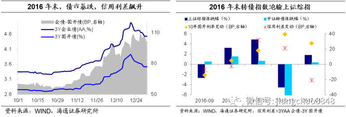 16年11-12月,紧货币去杠杆+券商代持事件+信用违约,债市大跌,利差飙升,转债大跌。16年三季度债市再度大涨,流动性充裕的环境下,信用风险缓和,但到了四季度货币政策收紧、金融去杠杆成为影响市场的重要因素。资金面紧张,利率、信用、转债普跌,尤其是利率债大幅下跌,主要原因包括: