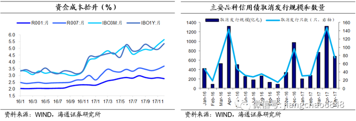 17年是监管大年,央行MPA考核从严、银保监会出台多项文件、资管新规从预期到落地,资管规模扩张受限甚至压缩,企业融资偏紧。央行多次上调操作利率,引导利率中枢上行。信用债取消发行规模大增,1季度取消发行规模超过1244亿元,涉及154只主要品种信用债;4月份取消发行规模更是达到了1315亿元,涉及147只主要品种信用债。
