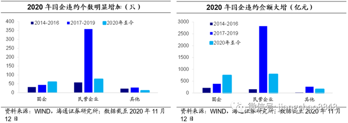 从违约主体看,如果说民企是17-19年违约潮的主角,2020年国企信仰的冲击则更为明显。2014-2016年民营企业债券违约个数占违约数量的51%,2017-2019年这一占比增至83%。但2020年以来,国企违约个数高达60只(截至11月12日),占比从17~19年的接近10%大增至41%。2020年11月10日永煤已发生实质性违约,除了此前已经信托违约的天房集团、近期的华晨集团外,还有很多尚未出现债券违约但在舆论风口的国企,比如混改受阻的云城投、债务压顶的泰达、海国鑫泰,以及受多元化或者企业业务拖累的周期性主体冀中能源等。除了国企信仰的冲击,房企“大而不倒”的预期也被泰禾集团的公开债违约打破。