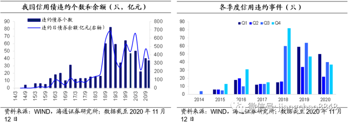 我国信用债违约现状:自14年超日债首次违约后,信用债市场一直处在破除刚兑篱笆的过程中。尤其是2018年以来,受2017年年底融资环境收紧影响,违约频率和规模陡增。分季度看,下半年信用违约事件相对于上半年更多。从违约主体看,如果说民企是17-19年违约潮的主角,2020年国企信仰的冲击则更为明显。