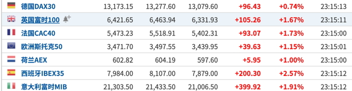在此消息影响下,截至发稿,道指期货涨幅一度扩大至近2%,纳指期货转跌,此前一度涨超1%。欧洲股市走高,法国CAC40指数、意大利富时MIB指数涨超2%,德国DAX指数涨1.5%。