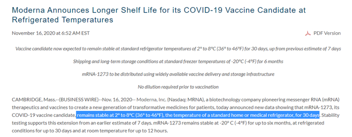 Moderna宣布其新冠疫苗有效性94.5%:冰箱温度下可存放30天