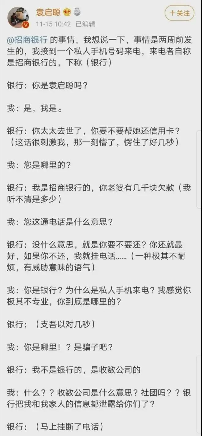 11月15日,资深车评人袁启聪发布微博,质疑招商银行将其及家人个人信息,泄露给“收数公司”(催收公司),引发广泛关注。