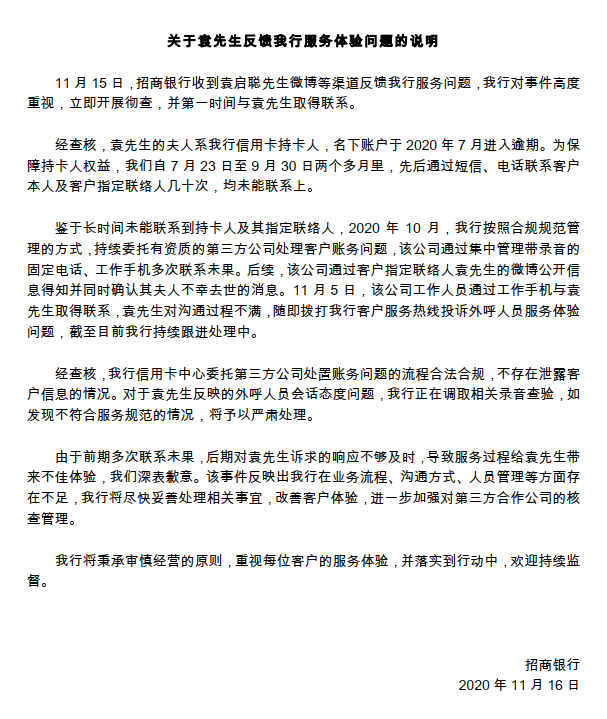 对于袁启聪在微博上爆料的经历,11月16日晚,招商银行发布了一份《关于袁先生反馈我行服务体验问题的说明》。