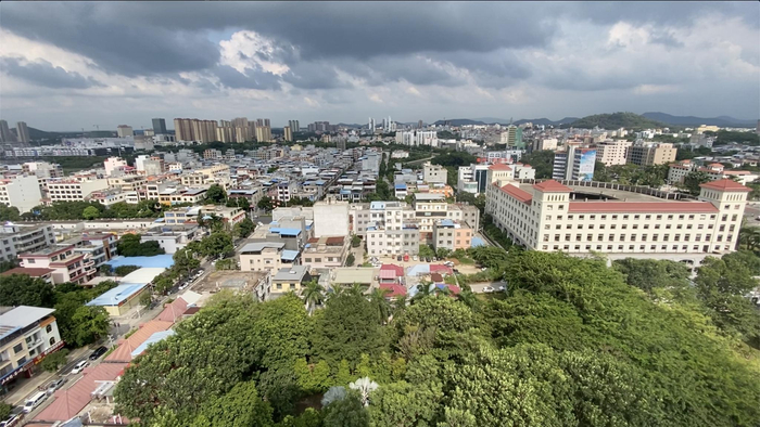 站在儋州市政府大楼望去,庄志银家在左,庄园广场在右。