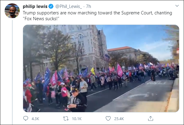 过去两周,特朗普与福克斯新闻的关系迅速僵化,其支持者也开始批评福克斯。14日,特朗普支持者在所谓“MAGA百万大游行”上高喊“福克斯烂透了”。