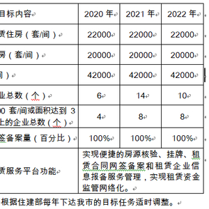 一是完善住房租赁机制体制。到2022年底,基本建成信息共享、便民高效、监管有力的全市住房租赁服务平台,形成市—区—街道—社区四级联动网格化服务管理体系,形成市场规则明晰、权益保障充分的住房租赁保障体系,实现城镇居民住有所居的目标。