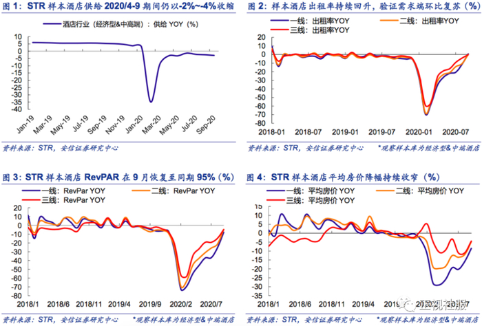 3)STR国内经济型&中高端酒店:根据STR的样本酒店库(经济型+中端)来看,2020年4~9月期间,每月的供给端同样均以2%~4%的比例同比下降,一定程度上也验证了酒店供给端收缩的趋势。同店经营数据来看,9月整体酒店入住率YoY+0.7%环比较显著好于8月(YoY-8.6%),平均房价YoY-6.1%环比8月(YoY-13.3%)降幅收窄,RevPar YoY-5.4%环比8月(YoY-20.7%)较显著收窄好于预期,继续验证国内商务和旅游住宿需求稳健恢复。