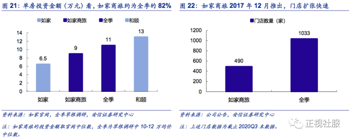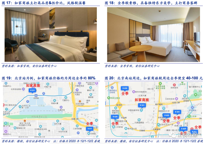 如家商旅通过差异化定位,主打高品质&性价比,在全季为主强势品牌地区同样实现了门店快速扩张。全季酒店作为华东和华北的强势品牌,在2012年就完成了初步的全国布点,并经过8年品牌扩张及下沉,至2020Q3门店数量至增至1033家,在国内中端酒店的地位已具备良好品牌和规模效应。如家商旅作为在2017年12月面向市场推出的新中端酒店品牌,对此采用了于全季差异化的定位,主要在三个方面切入:1)价位:如家商旅的平均房价相比全季会略低,以北京部分地区例子看(草根调研下来整体如家商旅的价位相对周边全季会略低,北京为区域性例子,仅供参考),价位大约为周边全季的8-8.5成左右,定位更多入门级的中端酒店品牌,形成价格带差异化。2)投资额:根据如家官网和全季草根调研,如家商旅的单房投资金额大约8.5~9.5万元左右,相比全季的10~12万元单房投资金额大约低15%~20%,并同样控制在4年左右的投资现金回收期,因此在初期投资上也形成差异化。3)风格:全季定位东方美学,更为素雅;如家商旅则聚焦“好吃”、“好睡”、“好住”,风格相对温馨。风格设计上同样形成差异化。因此,住客高性价比、较低投资成本,良好回收期,三方面推动如家商旅在2018~2020年期间收到消费者和加盟商的良好认可。