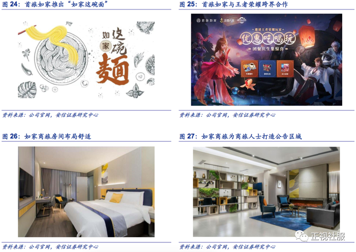 聚焦“好吃”、“好睡”、“好住”,公司提出“精选商旅之道”实现与其他中端酒店的差异化竞争。随着中端酒店品牌的持续崛起,国内中端酒店市场竞争已趋于白热化。对于酒店集团来说,服务模式及空间运营思路的转变已经成为必然。例如华住的全季4.0版本,公共空间打造“城市第三空间”、细分体验场景,并与小米科技合作推出智能客房;主打人文特色的亚朵酒店,围绕IP合作和人群运营,在服务产品化的同时促成生活方式品牌的落地。伴随着新生代消费群体的需求升级,产品的精细打磨、质效的双升优化以及宾客体验的场景式创新等多维度的转型提升,已经成为酒店核心竞争力的重要体现。公司提出“精选商旅之道”,聚焦商旅人士需求实现差异化竞争:①好吃:首旅如家以早餐优势为基础,结合中国各地独具特色的面食文化甄选117种当地特色面食,在近300个省市地区的2000多家酒店推出极具特色的“如家这碗面”主题餐饮服务;公司以首旅如家旗下中端酒店品牌”精选商旅系列的早餐菜品为基础为不同类型的商旅人士量身打造食谱;中高端酒店陆续推出特色下午茶服务,瞄准商旅人士市场。②好睡:“精选商旅之道”倡导“睡不够8小时,就要睡好每小时”的商旅安睡理念,发布“商旅人士睡眠绿皮书”,助力商旅人士解读睡眠情况并推荐助眠妙招;于3-4月间在精选商旅系列酒店内发起系列助眠行动。线下的真实场景加上“好睡”的触点延伸,突出商旅安睡理念的产品特性及品质。③好玩:酒店运营从酒店产品本身拓展至00后、90后年轻客群的运营,着眼于满足新兴消费群体及主流消费升级的需求,公司向互动体验式服务转变,例如首旅如家独创的HO岗位,带领客人去玩、去体验,在主动型体验式服务的场景中起到至关重要的作用。例如公司引入跨界合作联合当下热门手游推出“电玩时刻”,为客人带来游戏福利。