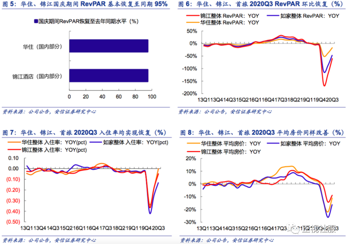 锦江、华住、首旅的2020Q3经营数据环比Q2均实现修复改善。1)锦江酒店:境内整体酒店看,2020Q3/Q2酒店RevPAR为-14.5%/-34.5%,环比较显著修复且优于行业平均水平。2)首旅酒店:2020Q3整体成熟店RevPAR-31.2%(环比Q2-50.9%大幅收窄),入住率-14.0pct,平均房价-17.5%。3)华住酒店:2020Q3整体RevPAR(剔除DH并表因素)-19.8%,平均房价-13.5%/入住率-6.5pct。