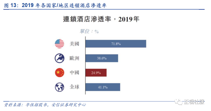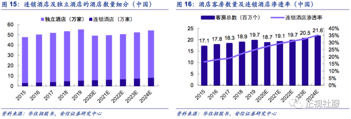 我国连锁化渗透空间大,为国内连锁品牌加盟扩张提供了广阔市场。截至2019年12月31日连锁酒店客房数仅占中国酒店客房的24.9%,远低于全球平均的约41.1%。根据弗若斯特沙利文预计2020年至2024年的中国酒店客房总数将以3.7%的复合年增长率较为平稳地增长,但同期的连锁客房供应复合增速达10.5%,预计国内连锁酒店渗透率将于2024年进一步增长至35.2%,为公司未来加速连锁酒店网络布局和轻资产加盟扩张带来巨大机会。根据华住招股书,中国三线或以下城市的酒店行业连锁酒店渗透率相对较低(2019年约为21.1%),中端酒店和经济型在中长尾地区仍有较广阔的市场有待开发。