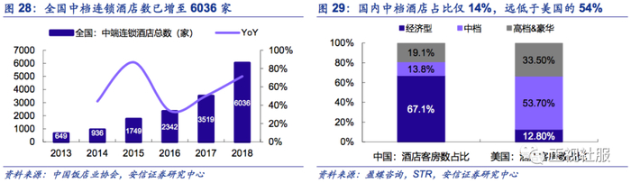 从结构来看,中端酒店符合未来3~5年国内消费升级下的酒店需求趋势,行业红利依旧可观。中端酒店凭借符合国内商务出差的消费升级和报销额度提升,自2014年开始在一二三线城市开始快速扩张,根据中国饭店业协会数据,全国中端连锁酒店的总数已从2013年649家增长至2018年6036家,增长快速;但根据STR的样本酒店分布来看,全国酒店行业的客房占比中,中档酒店在国内样本酒店中占比仍仅13.8%,远低于美国的53.7%。未来在一二线房租上升倒逼+人工成本提升+报销额度提升推动下,预计中档酒店的占比有望持续提升。