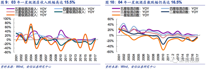 复牌03年非典和08年金融危机,酒店行业在下行期过后的1年中均呈现出低端单体出清,大型连锁酒店市占率加速提升的趋势。一二星级酒店多为单体酒店下,在酒店行业进入下行期是酒店业主资金的周转能力也更差(品牌酒店的营业数据更好,银行抵押贷款上具备一定优势,且部分大型连锁品牌酒店在危机时会提供现金贷款,帮加盟业主度过现金流危机),复盘03年非典和08年金融危机过后,其后的1~2年均可以看到会有大批量的低星级单体酒店出清:2004年一星级酒店数量同比大幅减少16.5%,四五星级酒店同比增多22%和34%;2009年一星级酒店数量同比减少12.0%,四五星级酒店则同比增多17%和9%。