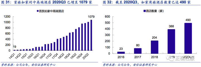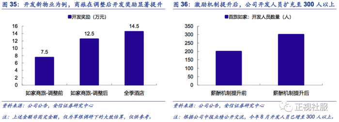 在销售层面,首旅如家的酒店开发人员薪酬水平在过去几年一直处于行业中低水平,而今年上半年成功实施了开发人员的激励机制优化后,根据首旅酒店的高管2020年中报业绩公开交流会的数据,本次公司激励激励上调后,开发人员整体收入相比调整之前增幅达30%~40%,核心提升部分为成功签约并开业门店下的加盟费提成比例,整体的综合收入有望从行业中低水平提升至行业中等水平,并借助品牌力和产品力下,开发人员数量本次也实施了显著的扩招,由200多人扩展至目前的300多人。综上所述,我们认为公司销售端的激励优化有望对存量开发人员的激励提升,帮助加速开店,且人员扩招至300多人,对短中期的加速开店均有望实现正向的推动作用。