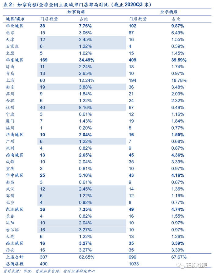 门店数的区域分布来看,如家商旅二三线城市占比相较全季更高,未来西南、华南、华中地区有望加密且优势省份仍具备较好下沉空间。我们根据首旅如家、华住官网得到如家商旅与全季酒店在全国主要城市的门店布局情况,对比之下发现如家商旅在扩张上有以下特点:①二三线布局相对更多:如家商旅在主要城市的门店数量占比为62.65%,较全季低5.01pct,其中北京/上海的门店数量占比为3.06%/12.24%,均显著低于全季水平(6.49%/18.78%),呈现出更加分散的布局态势,或因如家商旅与全季定位客群不同且平均房价低于全季,与全季形成差异化竞争占据更多的低线市场份额。②北方地区布局更加深厚:如家商旅较全季布局更深厚的主要城市大多位于北方,如天津、青岛、哈尔滨等城市;同时在南方地区的主要城市与全季水平相差不大,如苏州、厦门、南京等。在北方拥有较为深厚根基的情况下,公司未来有望以北方为主阵地持续向全国进行辐射布局。③西南、华南、华中地区有望加密:如家商旅与全季在西南、华南、华中地区门店布局明显较为薄弱,如家商旅在三个地区主要城市门店占比分别为2.65%/2.04%/5.10%,在全国布局中处于较低水平,未来在该三个区域扩张及优势的华北华东地区下沉仍具备良好空间。
