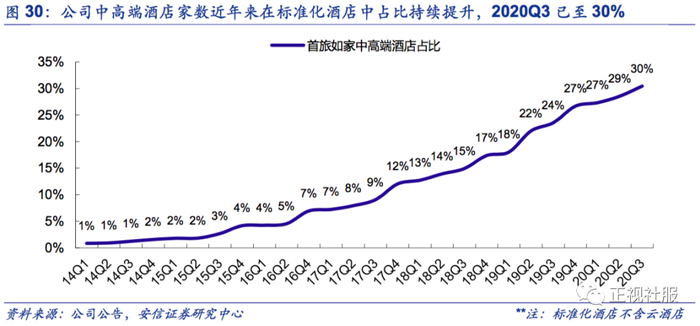 公司旗下中端酒店主力品牌——如家商旅酒店数量快速扩张,且未来三年有望进一步加速扩张。根据公司总经理孙坚在首旅酒店2020Q3公开业绩交流会中表示,首旅如家经济型酒店占比将逐渐下降,未来将持续在中端、中高端发力。截至2020Q3,公司中高端酒店家数已至1079家,占标准化酒店总数量(不含云酒店)的30.4%,较2019年底提升3.8pct。2020Q1-3如家商旅逆势展店实现净开店102家,总门店数达490家,展现出品牌的良好的产品力及市场认可度,结合公司在“三年万店”指引(20Q3业绩交流)中提出未来中高端酒店将在公司至万店总数时,品牌结构占比预计在30-40%;以如家商旅20Q3在公司中高端酒店中占比约45%进行推算,2023年如家商旅酒店数量或有望至1350-1800家,预计在未来3年中的新开店速度或有望进一步加速。