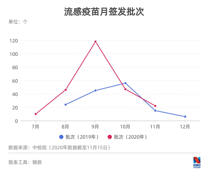 与批次共振,今年的流感疫苗签发量高峰期也出现在9月,数量高达2190.89万支(瓶),而去年9月、10月的签发量均在1000万支(瓶)左右。