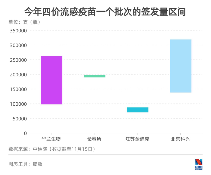 从今年四价流感疫苗一个批次的签发量看,华兰生物、北京科兴的弹性都很大——华兰生物一个批次的签发量区间为9.7万支(瓶)~26.1万支(瓶),北京科兴一个批次的签发量区间为13.8万支(瓶)~31.9万支(瓶),长春所的弹性虽然不大,但其每个批次的数量并不低,大约在19万支(瓶)左右。