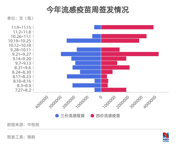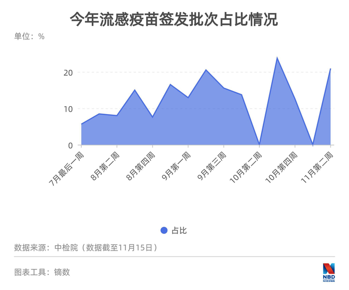 由于批签发时间和签发量高峰提前,今年过了10月上旬,流感疫苗周签发量为0也很快来了——10月第二周(10月12日~18日),流感疫苗签发量为0;11月第一周(11月2日~8日),签发量也为0。不过,上周(11月9日~15日),流感疫苗的签发量达441.13万支。
