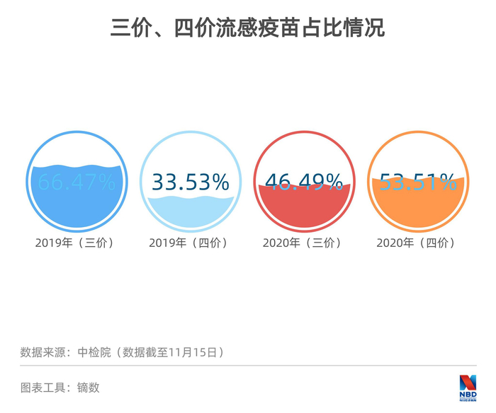 相比2019年流感季,今年三价流感疫苗签发量增加了290.49万支(瓶),而四价增加了1565.27万支(瓶)。三价流感疫苗的占比也由2019年的66.47%降至46.49%,相应的,四价流感疫苗占比则由33.53%提高至53.51%,提高约20个百分点。截至11月15日,今年四价流感疫苗的签发量已经超过三价流感疫苗。